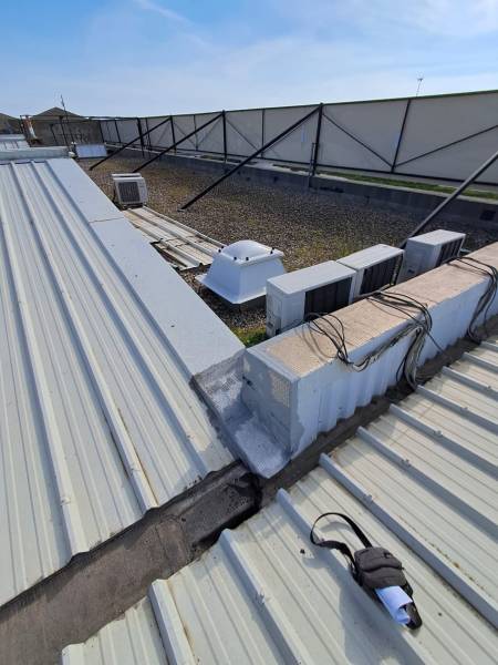 ➡️ Problématique : Toiture bac acier d’un entrepôt de 1 000 m², infiltration sur un pan secondaire, mousses sur les évacuations